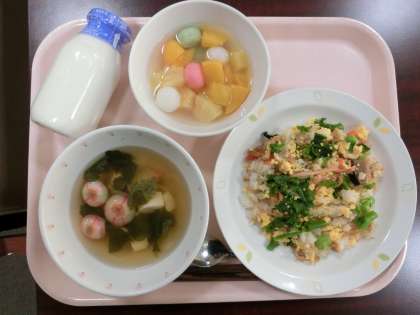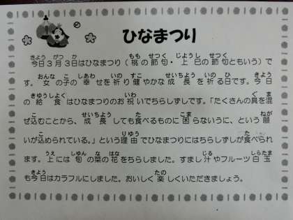 今日3月3日は「ひな祭り」です。そして、今日の給食は「ひな祭り献立」でした。ちらしずし・すまし汁・フルーツ白玉。どれもみなカラフルでとてもおいしそうです。子供たちからは歓声があがりました。栄養士さんや調理員さんたちが、心を込めて作ってくださった給食は、子供たちのお腹と心を幸せにしました。
