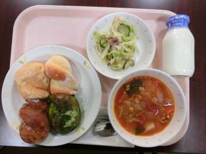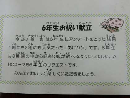 今日の給食は、「6年生お祝い献立」でした。1年生から5年生までは、砂糖あげパンなのですが、6年生だけは、ココア・きな粉・抹茶という3種類の中から自分の好きな味のあげパン1種類が選べるのです。あげパンやABCスープなど、6年生の好きなものばかりの献立。6年生は大喜びでした。