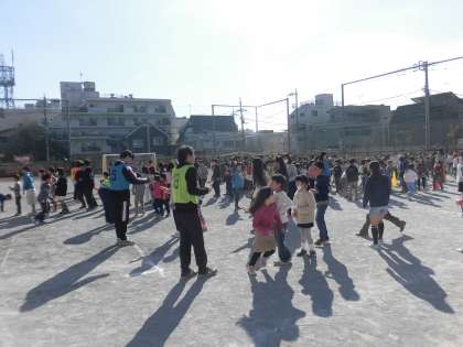 今朝は、今年度最後のゲーム集会が校庭で行われました。
