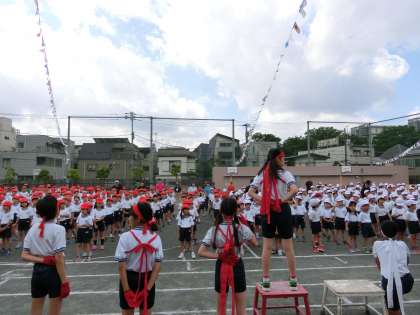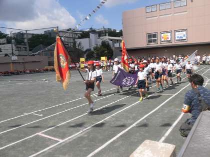 開会式が行われました。校旗、応援団を先頭に見事な入場行進です。元気に運動会の歌も歌いました。