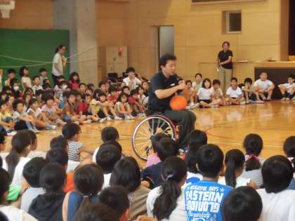 パラリンピック元日本代表(車いすバスケットボール)三宅克己さんをお招きして行われました。2時間目は、全校で講演とデモンストレーション。3時間目は、5年生が車いすバスケの体験をしました。