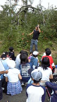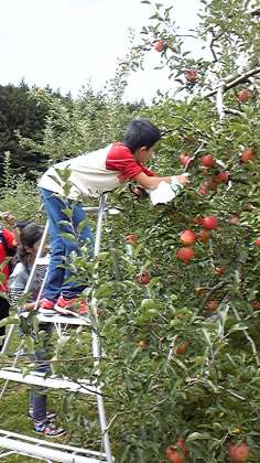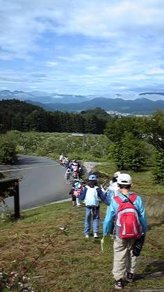 川場移動教室3日目は、青空が広がり山なみがきれいに見えました。お世話になったなかのビレッジをあとにして村巡りに出発しました。畑の野菜や農家の様子を見ながら、歩きました。りんご農園でりんごもぎをしてジュースをいただきました。昼食後SLに乗りました。楽しい思い出がたくさんできました。