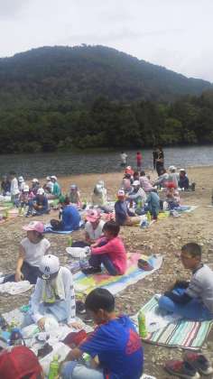 湯ノ湖の畔で、お弁当です。湖を渡る風は爽やか。子供たちは、美味しく食べています。