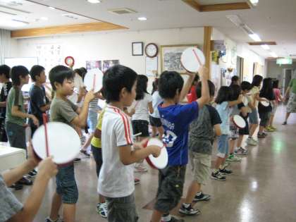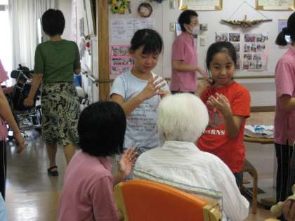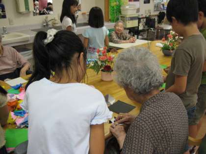 9月22日、4年生は、上北沢ホームを訪問し、ホームの入居者の方々と交流をしました。はじめに、運動会で発表した「エイサー」を踊りました。次に、リコーダーで「オーラリー」を演奏しました。お年寄りのみなさんから拍手をしていただきました。そのあと、グループに分かれて、おはじき、折り紙、あやとり、けん玉、風船バレーをしていっしょに遊びました。おはじきの上手な方、折り紙でパンダをつくってくださる方もいらして、子どもたちは「すごい!」と驚いていました。楽しい交流ができました。