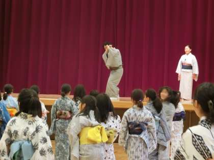 5年生が日本舞踊の体験をしました。全員浴衣を着て踊りました。