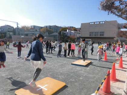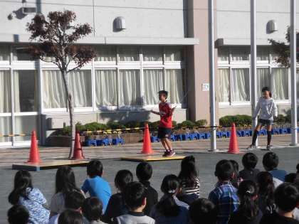 月曜日からなわとび期間が始まっています。全校朝会で、なわとび台の説明があり、休み時間にたくさんの子が挑戦しています。