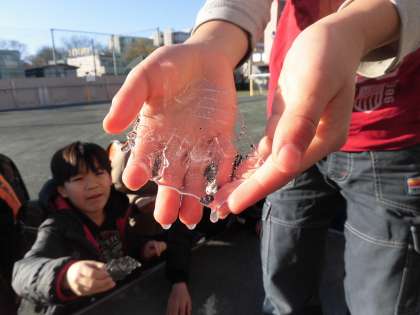 今朝は、校庭の朝礼台に氷が張っていました。それに気が付いた子供たちは大喜び!本格的な冬が近づきますね。