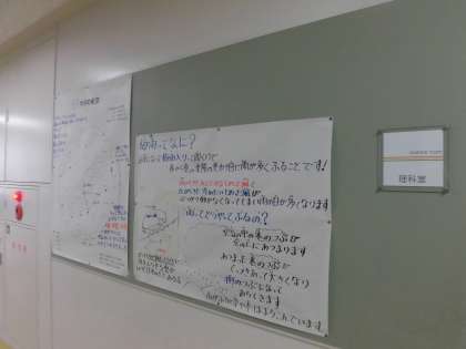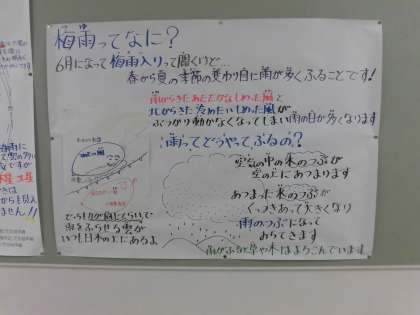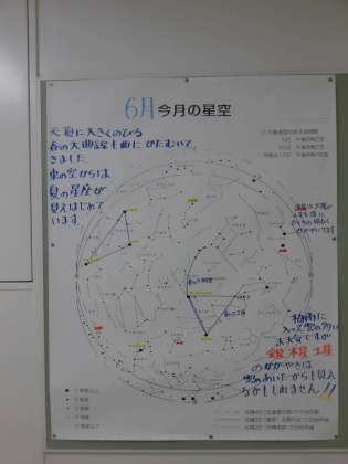 理科室前の掲示板には、6月の星座と梅雨のメカニズムについて掲示しています。