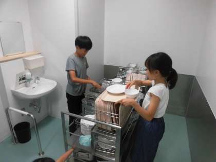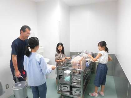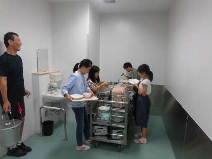 給食を食べたあと、ワゴンを先生と一緒に返却します。食器や食管をきれいに返せたかな?