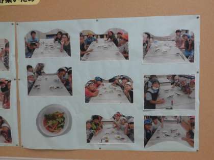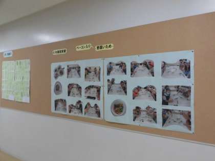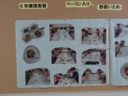 家庭科室の廊下には、6年生の調理実習の様子が掲示されています。どうぞご覧ください。