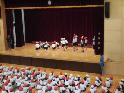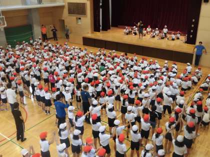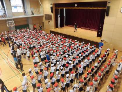 今朝の体育朝会は、来週から始まる水泳指導のルールなどについて、全校で確認しました。