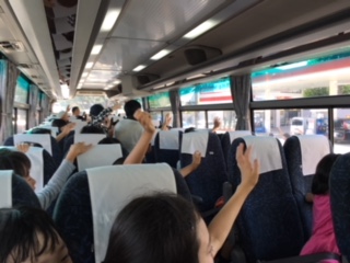 見送る保護者の方々、先生に手を振って応えます。車内では、もうバスレクが始まっています。
