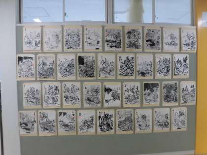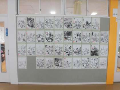 先日のHPでお伝えした墨絵が仕上がり、廊下の掲示板にはってあります。なかなかの出来栄えですね!