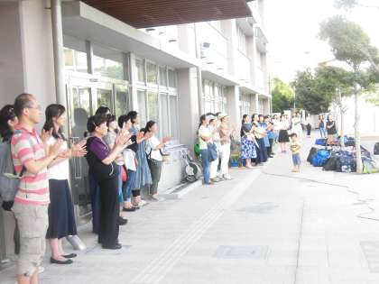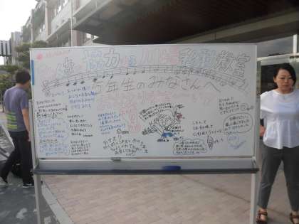 お帰りなさい!保護者の方も出迎えくれました。先生たちもボードにメッセージを書いてくれました。