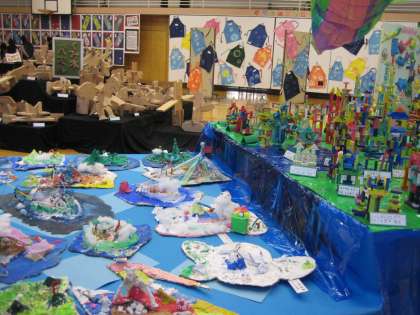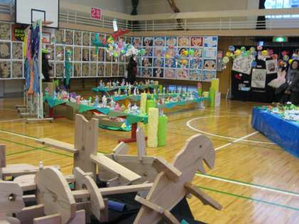 美術館のようになった体育館には、子どもたちの力作・大作がいっぱいに並びました。どの作品も、その子どもらしい表現で、一人一人の個性が光っていました。子どもたちは、「わあ、すごいね!」「これ、きれい!」と、作品を見ながら友だちや他の学年のよいところをたくさん見つけていました。19日には、上北沢保育園の園児のみなさんも見に来てくれました。多くの保護者の皆様、地域の皆様のご来場ありがとうございました。