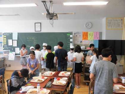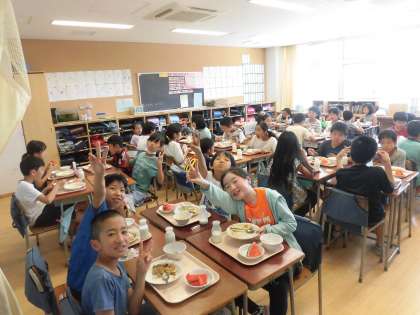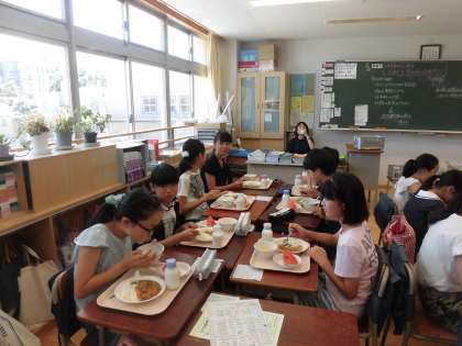 給食を仲良く食べています。暑い日でしたがよく食べていました。