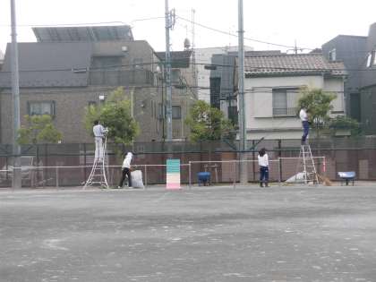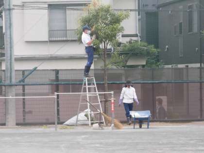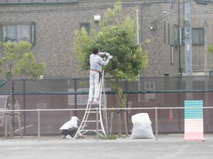 雨が止んでいるタイムミングで、主事さん方が剪定作業をしてくれました。