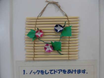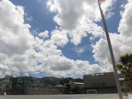 すっかり夏の雲になりました。事務室前には、事務室の露木さんお手製のアサガオが飾られました。素敵ですね!