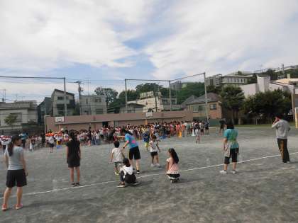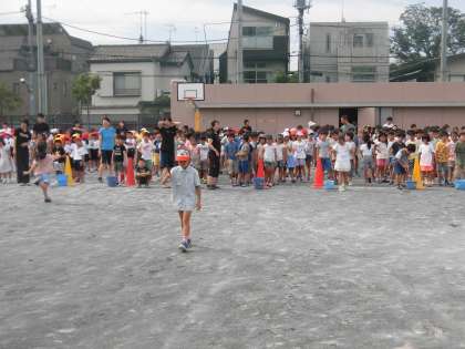 今朝は、ゲーム集会がありました。おたまに水をすくってゴールまでこぼさないように運びます。