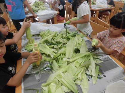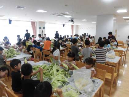 2年生全員で、全校分のとうもろし190本の皮をむいてくれました。とても楽しそうでした♪