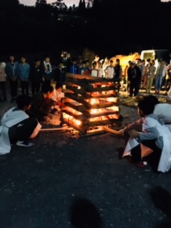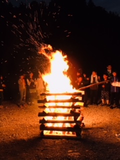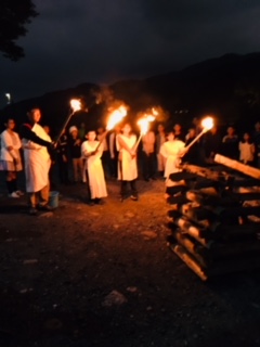 火の神と火の子によって、炎が点火されました。あれ、火の神様はなぜか眼鏡をかけている。