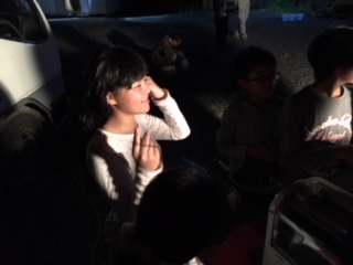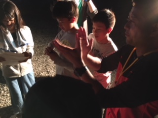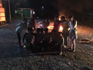キャンプファイヤー係の反省会が行われました。みんなと肩を組んで絆が深まった、楽しかった、様々な意見が出ました。最後にみんなで炎の前で、写真を撮りました。いい思い出をありがとう。