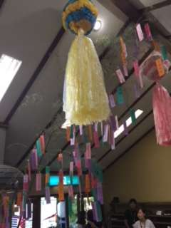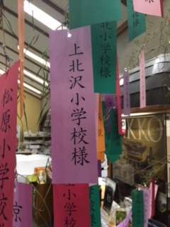 旅館の玄関に七夕飾りがあります。短冊をよく見ると、世田谷区内の各小学校の名前が。もちろん上小のもありました。