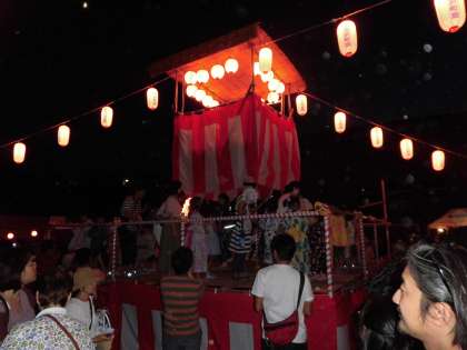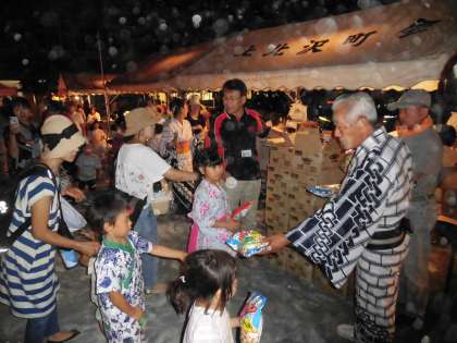 すっかり暗くなりました。子どもたちがドラえもん音頭を踊りました。踊った後は、新井会長や校長先生からお菓子をもらいました。