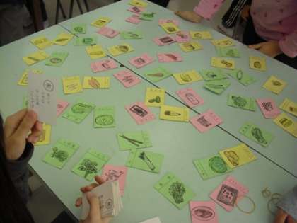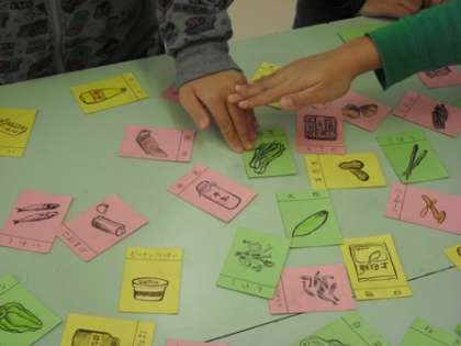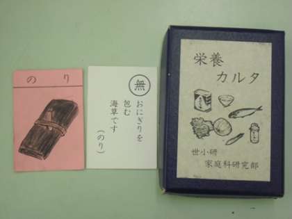 例えば無機質では、読み札が「白くて 小さな 干した魚」ならば『シラス』を取り、「おにぎりを包む 海草です」ならば、『のり』を取る。というようにするカルタです。