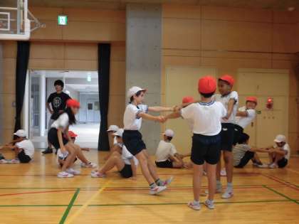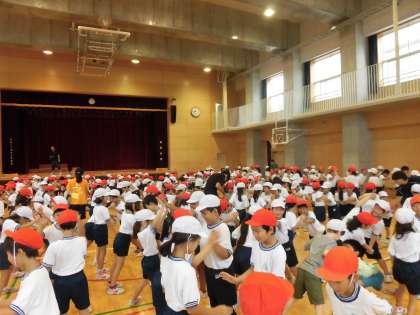 雨のため、1年生から4年生が体育館で体育朝会を行いました。