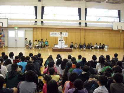 各クラスの代表12人が全校児童の前でスピーチをしました。学校や家庭など身近なことを題材に自分が考えたことを立派に発表しました。どの代表者もとっても素晴らしいスピーチで、聞いていた子どもたちはスピーチに引きつけられていました。どのスピーチの後にも自然に盛大な拍手がおこりました。