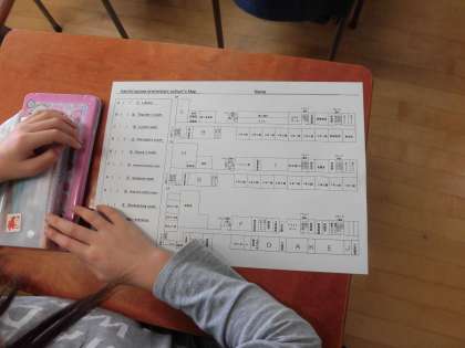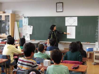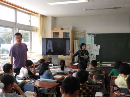 今日は、1組で2組担任の星野先生が授業をしました。上小の校舎図をみながら、英語で提示される教室をどこかなと考えました。