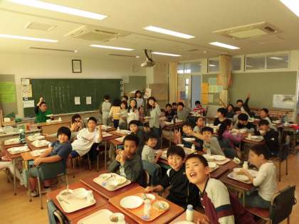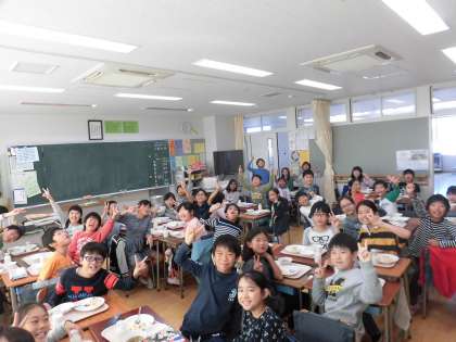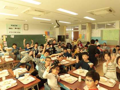 「給食はおいしいかー」「おいしいー」パシャ!!アメリカ横断ウルトラクイズ調(古いね)で撮りました。