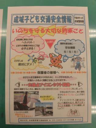 昨日、世田谷区内で痛ましい交通事故がありました。この場を借りて哀悼の意を表します。本校では、2度とこのような事故がおこらないように、校長先生からお話がありました。また、学級での指導とあわせて、成城警察署からいただいた交通安全の資料も配布しますので、ご家庭でもご指導お願いします。
