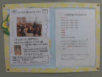 今朝も読み聞かせがありました。「おはなしたんぽぽ」の掲示板(職員室前)も更新されましたの、どうぞご覧ください。よろしくお願いします。