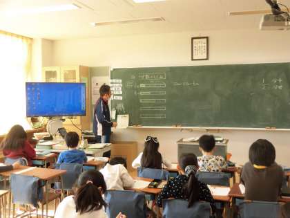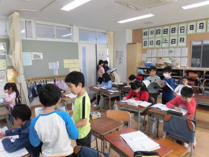 長さの学習です。実際に長さを計ったり、子供たち同士で教え合ったりしていました。