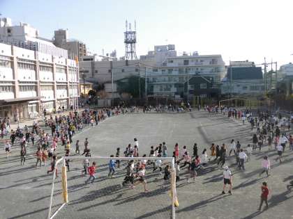 今朝は、体育朝会でした。マラソン期間ということで、全校で走りました。