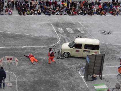 成城警察の方、世田谷区の担当者の方、スタントマンの方々が来てくださり事故を再現しながら、交通安全について学びました。