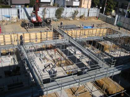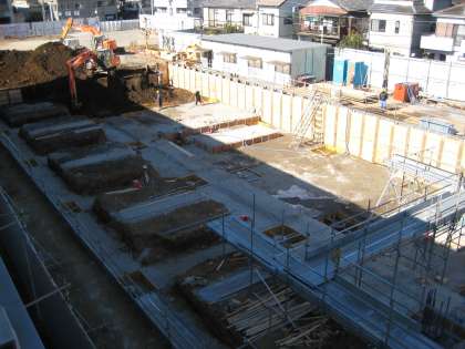 校舎の改築工事は、普通教室棟の基礎工事が進んでいます。現在、基礎工事として配筋、コンクリート工事などが行われています。仮設校舎の北側教室から、工事の進み具合がよく見えます。子どもたちも興味を持って見ています。常に、安全に十分気をつけて進めています。