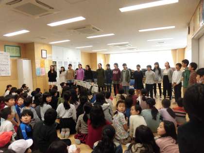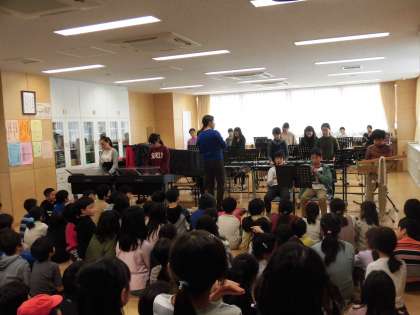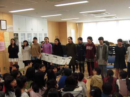 昼休みに、合奏・合唱クラブ発表会がありました。1年間練習した成果を披露しました。合唱は「HEIWAの鐘」、合奏は「打ち上げ花火」「名探偵コナンのテーマ」でした。たくさんのお客さんも来てくれました。