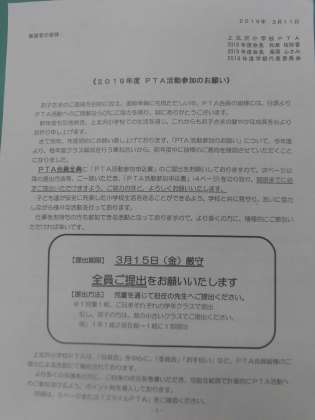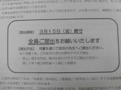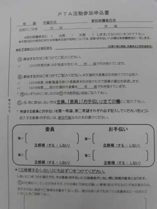 PTA活動参加申込書の締め切りが明日の15日に迫っています。お忘れなきようお願いします。