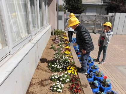 春を感じる暖かさになり、たくさんの子供たちが校庭に出てきました。1年生は、植物の水やりをしていました。ほのぼのしますね!