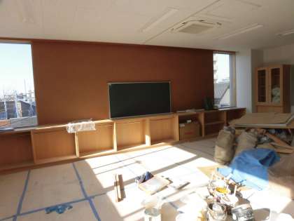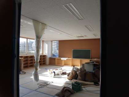 3Fのホールが教室へと変わりつつあります。つつ、といってももう少しのところまできました。黒板も入り、ロッカーも取り付けられました。思ったより日差しが入るので明るいです!