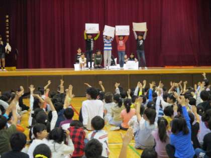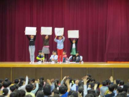 集会委員会主催のステレオゲーム集会が行われました。首魁の後は、生活指導の村上先生から安全な生活についての注意がありました。