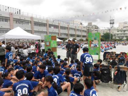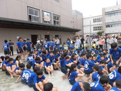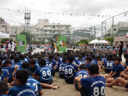 5,6年生「心〜つながろう上小へ〜」演技開始前、子供たちの気合が伝わります。先生も緊張です・・・