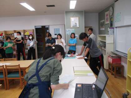 読書週間ということもあり?先生方が図書の貸し出しについてレクチャーを受けました。今年度よりPCによる貸し出しが始まっています。