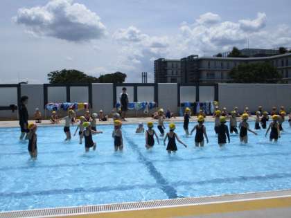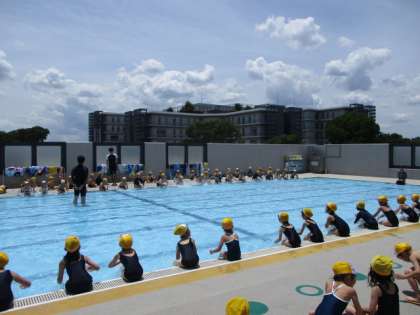 今年度のプールが始まりました。水位は大人のひざ上ぐらいからスタートです。みんな気持ちよかったかな?