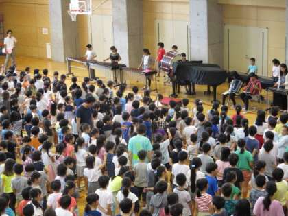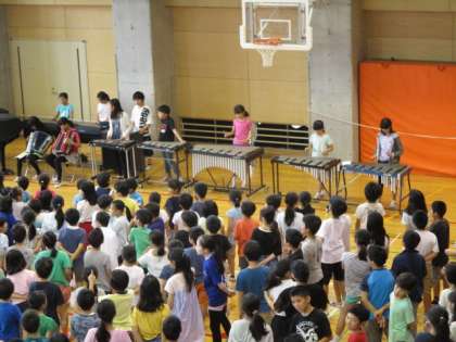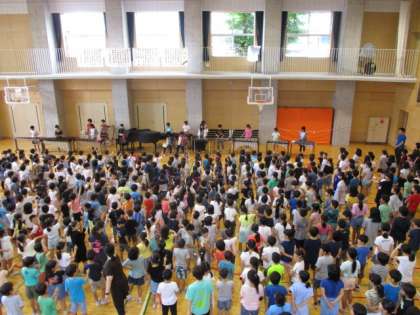 けさは音楽集会でした。全校で「虹」を歌いました。