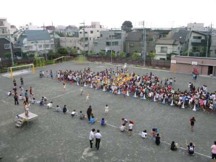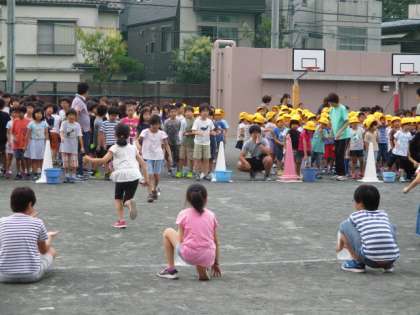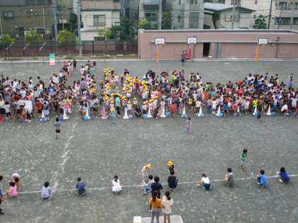今朝の集会は色水リレーをしました。みんな汗だく!