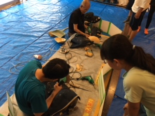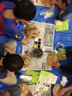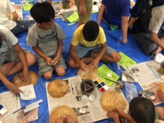 夕顔の実を乾かした物に絵を書きます。最初は下絵をチョークで書いて、その後に絵の具を塗ります。3枚目の写真は、紐を通すために穴を開けているところ
